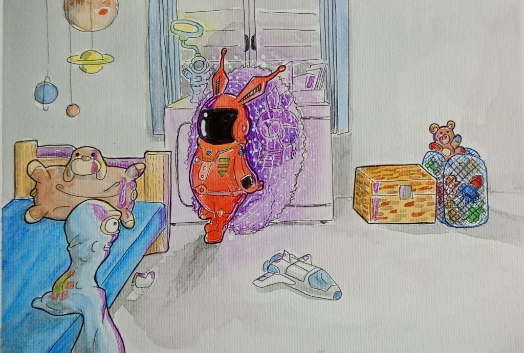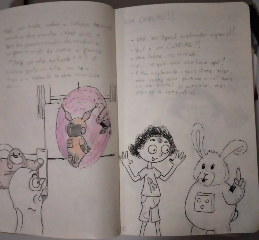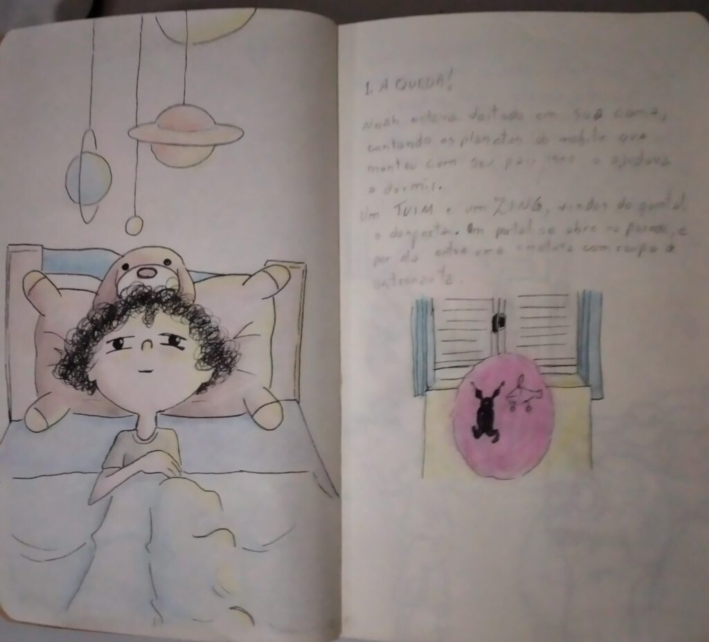 Tudo começou de forma simples: um moleskine, lápis e a ideia de transformar um momento cotidiano — Noah deitado na cama, sonhando — no ponto de partida para uma aventura intergaláctica.
