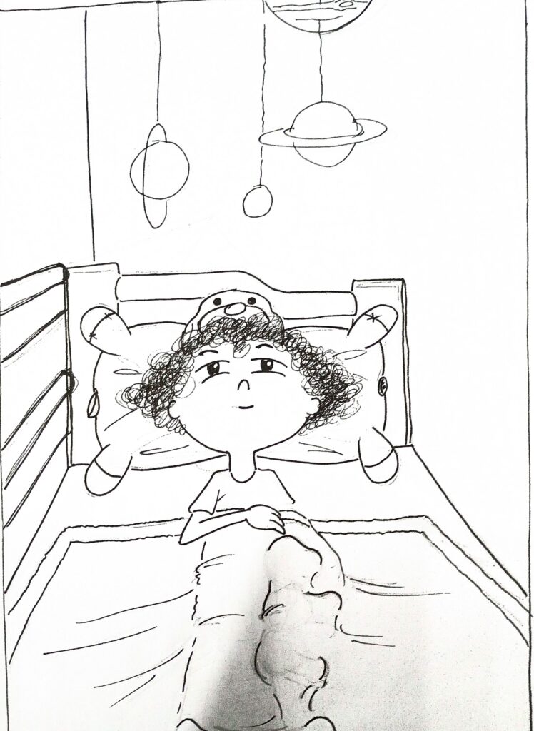 Do esboço inicial, parti para construir o ambiente: o quarto, o móbile de planetas, a expressão do Noah e o travesseiro de cachorro.
