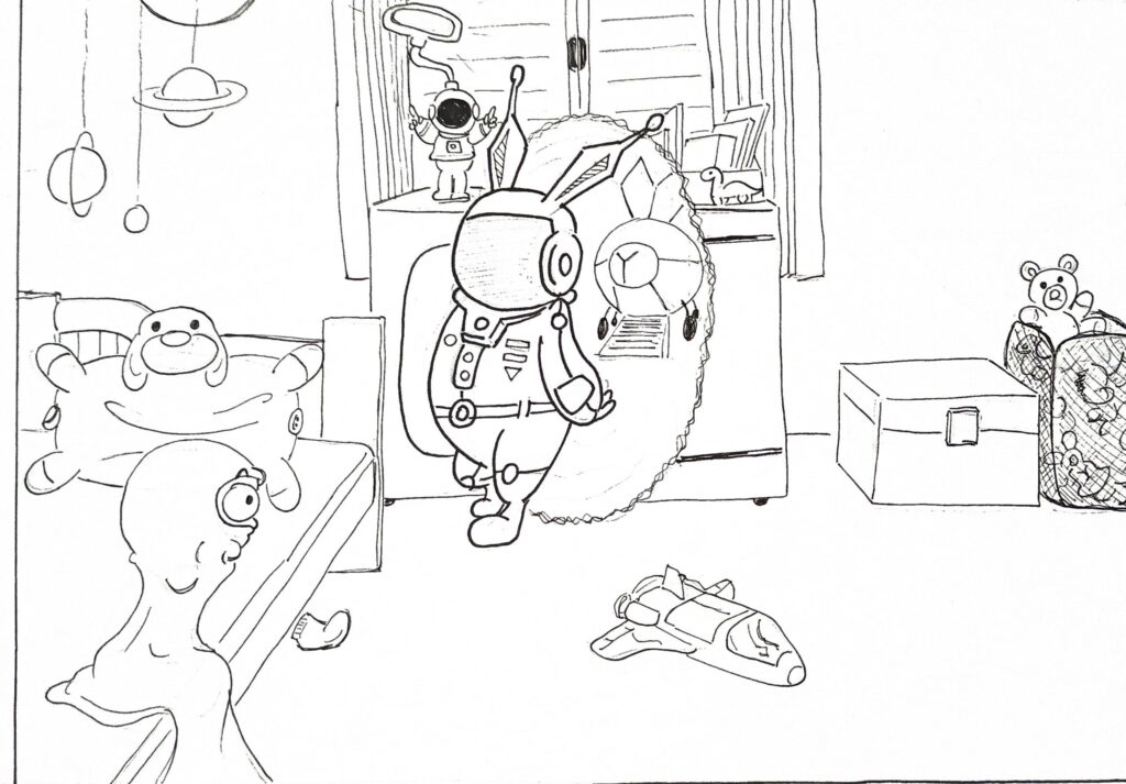 Com o lápis definido e a caneta finalizando as linhas, cada elemento ganhou clareza: o quarto, as naves, os brinquedos espalhados. Era como se a imaginação começasse a “ficar real” no papel.
